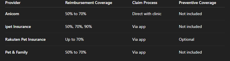 ProviderStarting Monthly PremiumCommon CoverageSpecial FeaturesAnicom„2,500Accidents, illnesses, surgeriesWide network of vet clinics, direct reimbursement (insurance002.exblog.jp)ipet Insurance„2,600Accidents, illnesses, cancerClaims processed via appRakuten Pet Insurance„3,200Accidents, illnesses, optional preventive careEarn Rakuten points (insurance002.exblog.jp)Pet & Family„2,800Accidents, illnesses, hospitalizationFlexible plans, coverage for older pets (insurance002.exblog.jp)